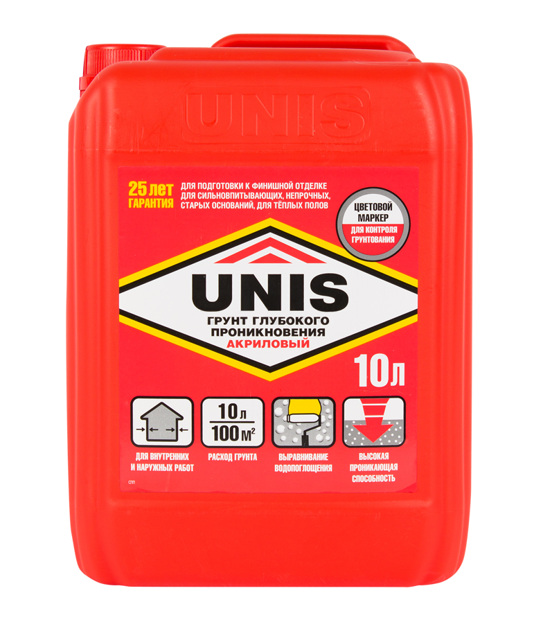 Грунтовка глубокого проникновения Unis предназначена для укрепления рыхлых, мелящих и сильновпитывающих оснований, а также для обработки поверхности перед нанесением ровнителей для полов, технологического обеспыливания поверхности. В качестве последующих к нанесению материалов могут быть использованы гипсовые и цементные растворы, лакокрасочные материалы. Идеально подходит для обработки облегченных пористых блоков и плит и других сильновпитывающих оснований.