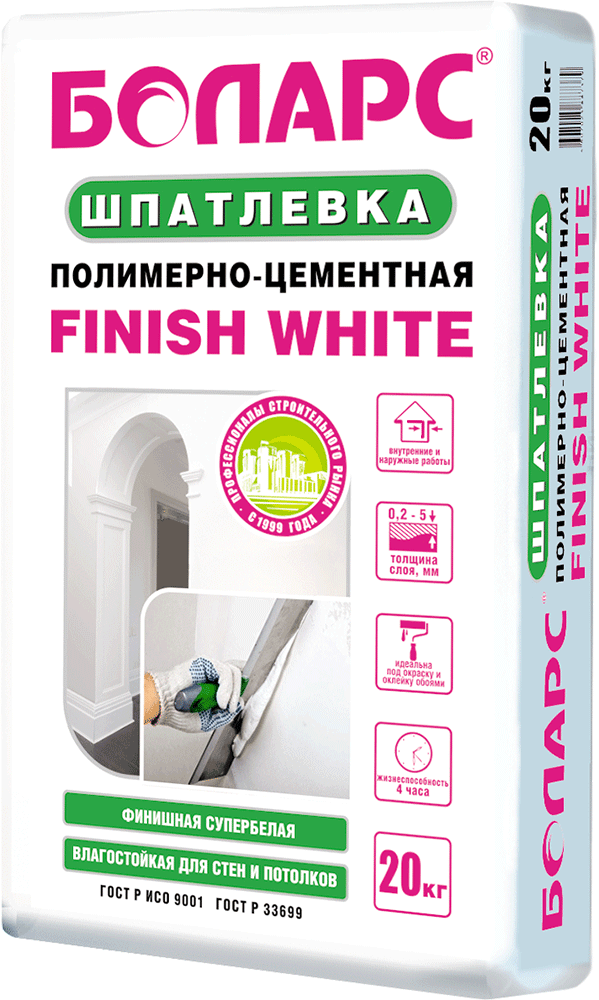 Шпатлевка БОЛАРС Finish White соединяет в себе преимущества двух видов шпатлевок: такая же белая, пластичная, послушная, как полимерные шпатлевки и в то же время прочная, влагостойкая – как цементные шпатлевки. Не размывается при грунтовании и нанесении обойного клея. Шпатлевка предназначена для финишного тонкослойного выравнивания стен и потолков в помещениях с нормальной и повышенной влажностью под окраску, нанесение декоративных покрытий, оклейку обоями. Для наружных работ применяется только под последующую отделку фасадными финишными материалами (краска, декоративная штукатурка). Образует после высыхания идеально ровную, гладкую поверхность, не подверженную образованию трещин и не мелящуюся. Соответствует ГОСТ Р 33699.