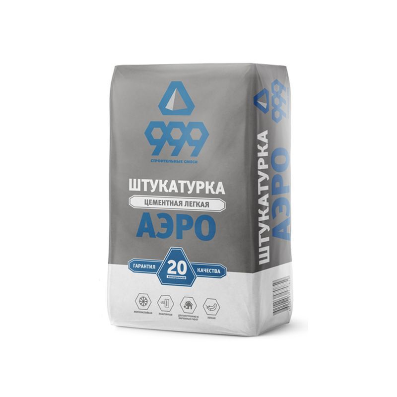 Штукатурка цементная 999 Аэро — универсальная смесь, которая может применяться как внутри зданий, так и снаружи. Применяется в помещениях с разным уровнем влажности. Формирует прочный слой под последующее нанесение декоративных покрытий — краски, облицовки плиткой и т.д. Перед нанесением штукатурки нужно убедиться в том, что основание сухое и прочное. Поверхность следует предварительно очистить от пыли, грязи, жиров и прочих загрязнений, которые снижают адгезию. Требуется удалить все отслоения и непрочные участки. Если основание сильновпитывающее, то его рекомендуется обработать при помощи универсальной грунтовки. Места, которые подвергаются образованию трещин, нужно укрепить армирующей сеткой из стекловолокна. Замешивать раствор необходимо строительным миксером до получения однородной и пластичной массы без комков. После этого ему нужно дать отстояться 3-5 минуты и снова размешать. В процессе нанесения важно проверять отклонения по вертикали и горизонтали, не допуская чрезмерных перепадов. Нанесенный состав нельзя высушивать принудительно, например, при помощи тепловой пушки или обогревателя. При выполнении фасадных работ важно обеспечить свежевыложенную штукатурку защитой от осадков в течение нескольких суток.