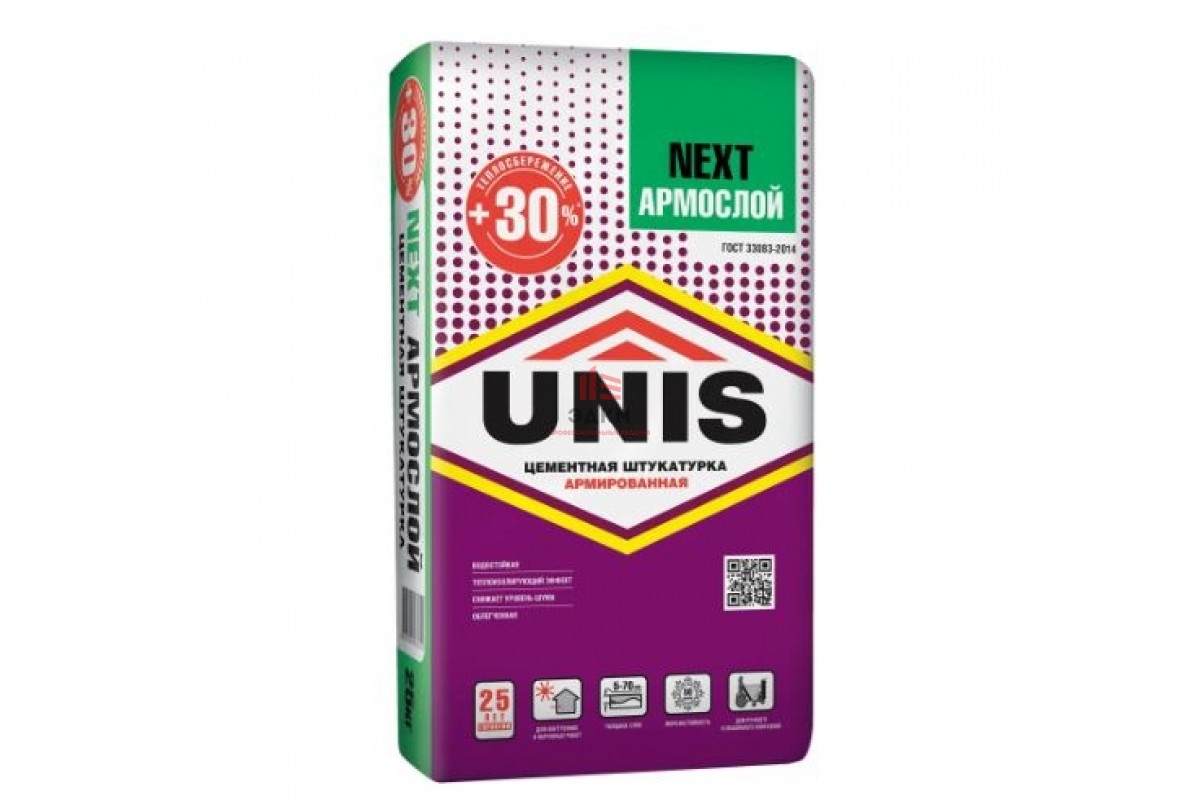 Штукатурка цементная Unis Next Армослой предназначена для выравнивания фасадов, внутри помещений при оштукатуривании стен и потолков слоем до 40 мм (без штукатурной сетки); для ремонта сколов, выбоин, раковин, трещин глубиной до 70 мм, з аполнения стыков ЖБИ.